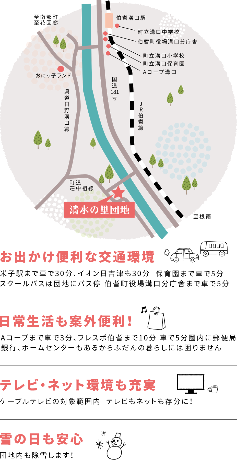 | 交通 | ◎路線バス:(米子駅行・日野病院行)「昭和橋」バス停まで徒歩約5分 ◎町デマンドバス:(町内循環)「荘」バス停まで徒歩1分 |